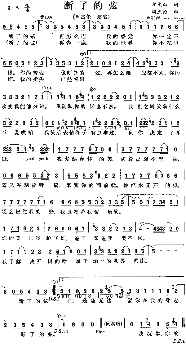 断了的弦 作词:方文山 作曲:周杰伦 编曲:钟与民 断了的弦再怎么连 我的感觉你已听不见 你的转变像断掉的弦 再怎么接音都不对 你的改变我能够分辨 我沉默你的话也不多 我们之间少了什么不说 哎哟我笑后 表情终于有点难过握着你的手 问你决定了再走 我突然释怀的笑笑声盘旋半山腰 随风在飘摇啊摇来到你的面前绕 你泪水往下的掉说会记住我的好 我也弯着我嘴角笑 你的美已经给了谁 追了又追我要不回 我了解离开树的叶 属于地上的世界凋谢 断了的弦再弹一遍 我的世界你不在里面 我的指尖已经弹出茧 还是无法留你在我身边 断了的弦再怎么连 我的感觉你已听不见 你的转变像断掉的弦 再怎么接音都不对 你的改变我能够分辨 |