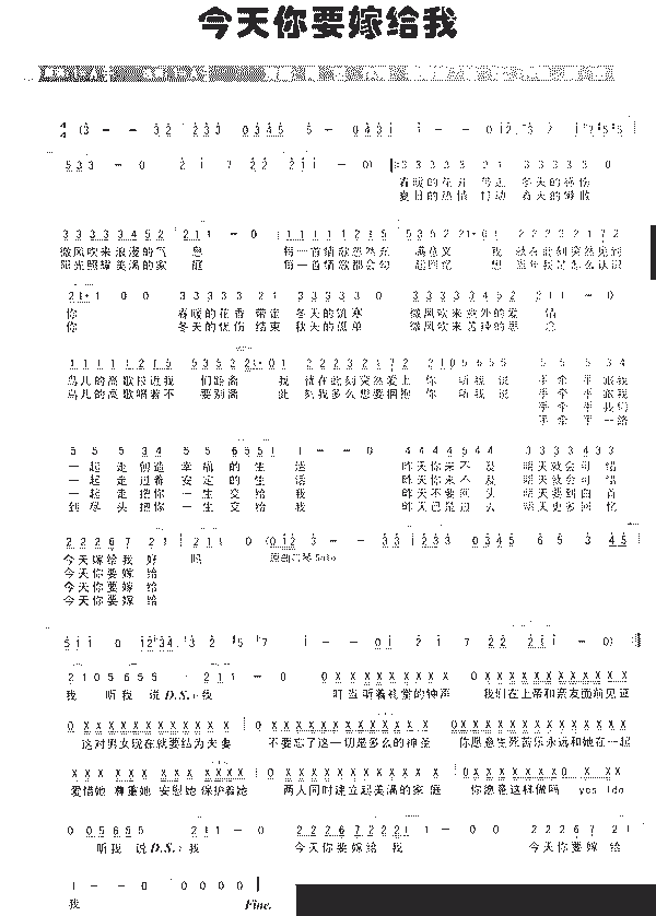 歌曲:今天你要嫁给我 歌手:蔡依琳&陶喆 专辑:太美丽 专辑:太美丽 春暖的花开带走冬天的感伤 微风吹来浪漫的气息 每一首情歌忽然充满意义 我就在此刻突然见到你 春暖的花香带走冬天的饥寒 微风吹来意外的爱情 鸟儿的高歌拉近我们距离 我就在此刻突然爱上你 听我说 手牵手跟我一起走 创造幸福的生活 昨天你来不及 明天就会可惜 今天嫁给我好吗 jolin in the house dt(david tao) in the house our love in the house 夏日的热情打动春天的懒散 阳光照耀美满的家庭 每一首情歌都会勾起回忆 想当年我是怎么认识你 冬天的忧伤结束秋天的孤单 微风吹来苦辣的思念 鸟儿的高歌唱着不要别离 此刻我多么想要拥抱你 听我说 手牵手跟我一起走 过着安定的生活 昨天你来不及 明天就会可惜 今天你要嫁给我 听我说 手牵手我们一起走 把你一生交给我 昨天不要回头 明天要到白首 今天你要嫁给我 听着礼堂的钟声 我们在上帝和亲友面前见证 这对男女生就要结为夫妻 不要忘了这一切是多么的神圣 你愿意生死苦乐永远和她在一起 爱惜她尊重她 安慰她保护着她 两人同时建立起美满的家庭 你愿意这样做吗 yes i do! 听我说 手牵手一路到尽头 把你一生交给我 昨天已是过去 明天更多回忆 今天你要嫁给我 |