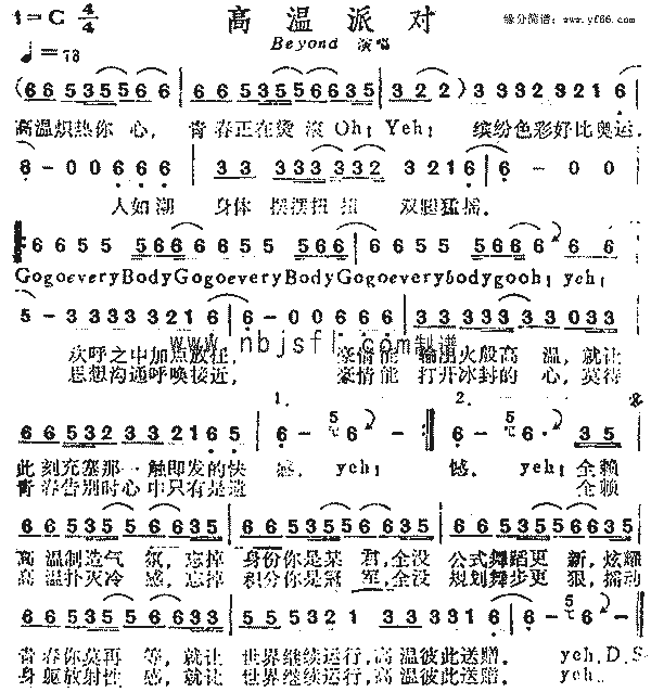 高温派对 词胡人.曲黄家驹.主唱 beyond. 高温炽热你心 青春正在翻滚 oh! yeh! 缤纷色彩好比奥运 人如潮身体摇摇扭扭双脚猛蹬 go go everybody go go everybody go go everybody go oh! yeh! 欢呼之中加点放任 豪情能输出火般高温 就让此刻充塞那一触即发的快感 yeh! go go everybody go go everybody go go everybody go oh! yeh! 思想流通呼吸接近 豪情能打开冰封的心 莫待青春告别时心中只有是遗憾 全赖高温制造气氛 忘掉身份你是某君 全没公式舞蹈更新 炫耀青春你莫再等 就让世界继续运行高温彼此送赠 全赖高温制造气氛 忘掉身份你是某君 全没公式舞蹈更新 炫耀青春你莫再等 就让世界继续运行高温彼此送赠 全赖高温扑灭冷感 忘掉积分你是冠军 全没规则舞步更狠 爷身躯放射性感 就让世界继续运行高温彼此送赠 |