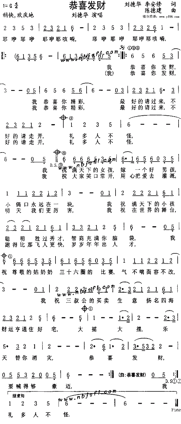 我恭喜你发财 我恭喜你精彩 最好的请过来 不好的请走开 礼多人不怪 我祝满天下的女孩 嫁一个好男孩 两小口永远在一块 我祝满天下的小孩 聪明胜过秀才 智商充满你脑袋 我祝尊敬的姑奶奶 三十六圈的比赛 气不喘面容不改 我祝三叔公的买卖 生意扬名四海 财运享通住豪宅 大摇~~~~大摆 乐天替你消灾 恭喜发财, 要喊得够豪迈. 恭喜发财 我恭喜你发财(我恭喜恭喜你发财) 我恭喜你精彩(恭喜恭喜你精彩) 最好的请过来 不好的请走开 礼多人不怪 我祝大家笑口常开 用心把爱去灌溉 明天呐我们更厉害, 我祝在世界的舞台 跑得比那黑人更快 岁岁年年出人才 大摇~~~~大摆 乐天替你消灾 恭喜发财 要喊得够豪迈 我恭喜你发财,(恭喜恭喜你发财) 我恭喜你精彩.(恭喜恭喜你精彩) 最好的请过来 不好的请走开 礼多人不怪 再来 我恭喜你发财 我恭喜你精彩 最好的请过来 不好的请走开 礼多人不怪. 恭喜发财 |