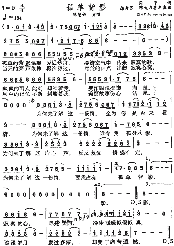 曲名:孤单背景 唱:陈慧娴词:简宁 曲:陈透男 陈大力 蒋东良 专辑:飘雪 编制:苍雨 孤单的背景温馨爱侣步过 凄净空气中传来寂寞的歌 飘飘的雨点此刻却吻着我 变作眼泪掩饰痛楚 为何未了解这一份情 全为你是否未看清 为何未了解这一份情 谁令我孤身只影 为何未了解这片心声 反反覆覆情感难定 为何了解这一份情 要我占人孤单背影 当天的笑声依稀再次掠过 丝丝的雨点串起寂寞心窝 风中的记忆不断刺痛着我 美丽故事伤心结果 寂寞的心尽是疑问 冷冷暖暖似假似真 浪漫岁月爱过多深 却变了痛苦遗憾 |