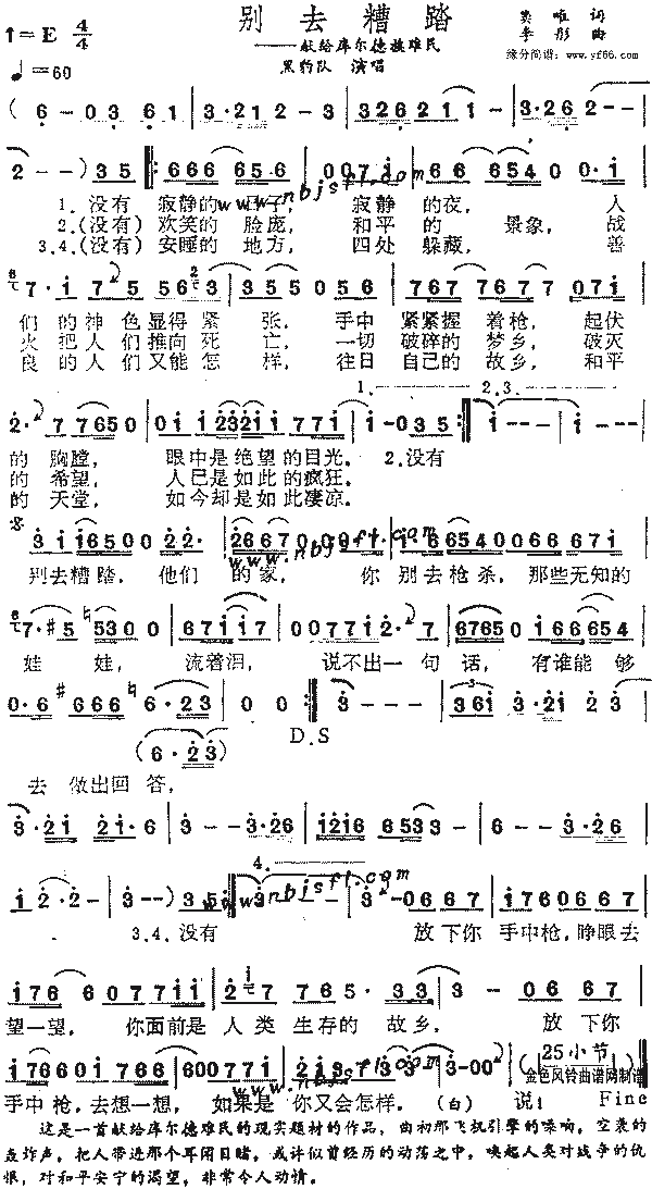 别去糟蹋 词:窦唯曲:李彤演唱:黑豹 没有寂静的日子寂静的夜 人们的神色显得紧张 手中紧握着枪 起伏的胸膛 眼中是绝望的目光 没有欢笑的脸庞和平的景象 战火把人们推向死亡 一切破碎的梦想 破灭的希望 人已是如此的疯狂 别去糟蹋他们的家 别去枪杀那些无知的娃娃 流着泪说不出一句话 有谁能够去做出回答 没有安睡的地方四处躲藏 善良的人们又能怎样 往日自己的故乡和平的天堂 如今却是如此凄凉 放下你手中枪 睁眼去望一望 你面前是人类生存的故乡 放下你手中枪 去想一想 如果是你又会怎样说... |