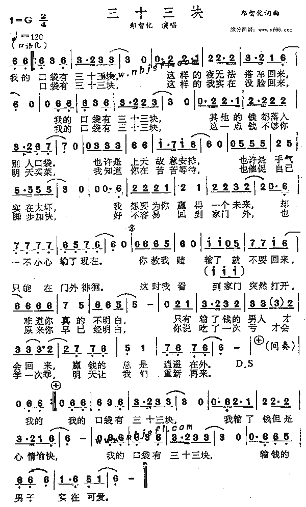 我的口袋有三十三块 这样的夜无法打车回来 我的口袋有三十三块 其他的钱都落入别人口袋 也许是上天故意安排 也许是手气实在太坏 我想要为你赢得一个未来 却一不小心输了现在 你叫我赌输了就不要回来 难道你真的不明白 只有输了钱的男人才会回来 赢钱的总是逍遥在外 这样的我实在没脸回来 这一点钱不够你明天买菜 我知道你在苦苦等待 也催促自己脚步加快 我好不容易才回到家门外 却只能在门外徘徊 这是我看到家门突然打开 原来你早已经明白 你说吃了一次亏才会学一次乖 明天让我们从新再来 我输了钱但是心情愉快 输钱的男人实在可爱 |