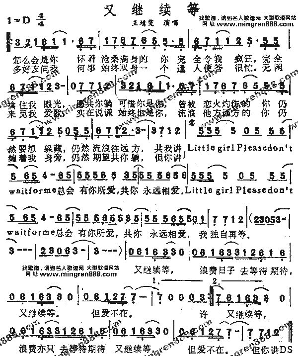 又继续等 怎么会是你怀着沧桑满身的你 完全令我疯狂完全擒住我眼光 愿共你躺 可惜你是你曾被恋火灼伤的你 仍然象要躲藏仍然流浪往远方 共我讲 little girl,please don't wait for me! 总会有你所爱共你永远想爱 oh little girl,please don't wait for me 总会有你所爱共你永远相爱 我独自再等 又继续等 浪费日子去等待冀待 又继续等但爱不在 许多好友问我何事始终只身一个 逢人便答很忙无闲来觅爱歌 实在说谎始终也是你 流浪他方远方的你仍缠着我心房 仍然希望共你躺但你讲 又在等 但你讲 |