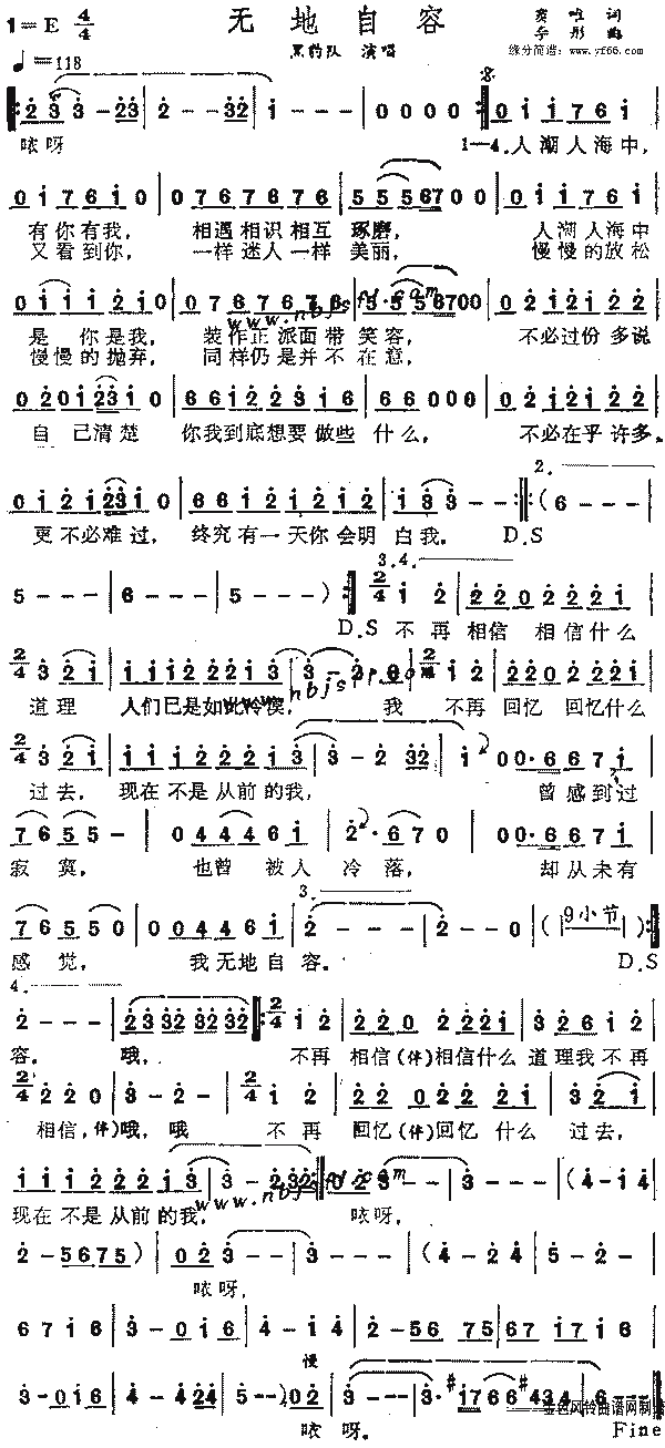 曲名:无地自容 唱:黑豹词:黄唯曲:李彤 编制:苍雨 人潮人海中有你有我 相遇相识相互琢磨 人潮人海中是你是我 装作正派面带笑容 不必过份多说自已清楚 你不必过份多说你自已清楚 你我到底想要作些什么 不必在乎许多更不必难过 总究有一天你会明白我 总究有一天你会离开我 人潮人海中又看到你 一样迷人一样美丽 慢慢的放松慢慢的抛弃 同样仍是并不在意 不再相信相信什么道理 人们已是如此冷漠 不再回忆回忆什么过去 我不再回忆回忆什么过去 现在不是从前的我 曾感到过寂寞也曾被别人冷落 却从未有感觉我无地自容 我不再相信 hi ye hi ye |