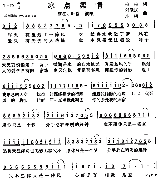 冰点柔情 男:满江女:叶蓓 (满)昨天夜里起了一阵风 吹皱春水吹散了梦 (叶)风在天亮前悄悄走了 留下微澜是水的心动 (满)撩起秀发是风的手 (合)飘过我思念的天空 枕边的泪痕是梦的行踪 泄露我隐隐的心痛 (满)我不愿你只是一个梦 (叶)分手总在黎明的晨钟 (合)我不愿你只是一场空 追到天涯海角也无影无踪 (满)我不愿你只是一个梦 (叶)分手总在黎明的晨钟 (合)我不愿你只是一阵风 心疼是真相逢是空 (满)爱只有失去的人最懂 我本凡俗无法超脱 (叶)每个人的爱各自有归宿 缘由天定执着是苦 (满)多想拥抱梦的背影 (合)追上风的脚步 让时间冰点就此凝固 你的去处我的归宿 (满)我不愿你只是一个梦 (叶)分手总在黎明的晨钟 (合)我不愿你只是一场空 追到天涯海角也无影无踪 (满)我不愿你只是一个梦 (叶)分手总在黎明的晨钟 (合)我不愿你只是一阵风 心疼是真相逢是空 (合)我不愿你只是一个梦 追到天涯海角也无影无踪 我不愿你只是一阵风 心疼是真相逢是空 (满)我不愿你只是一个梦 (叶)分手总在黎明的晨钟 (合)我不愿你只是一阵风 心疼是真相逢是空 |