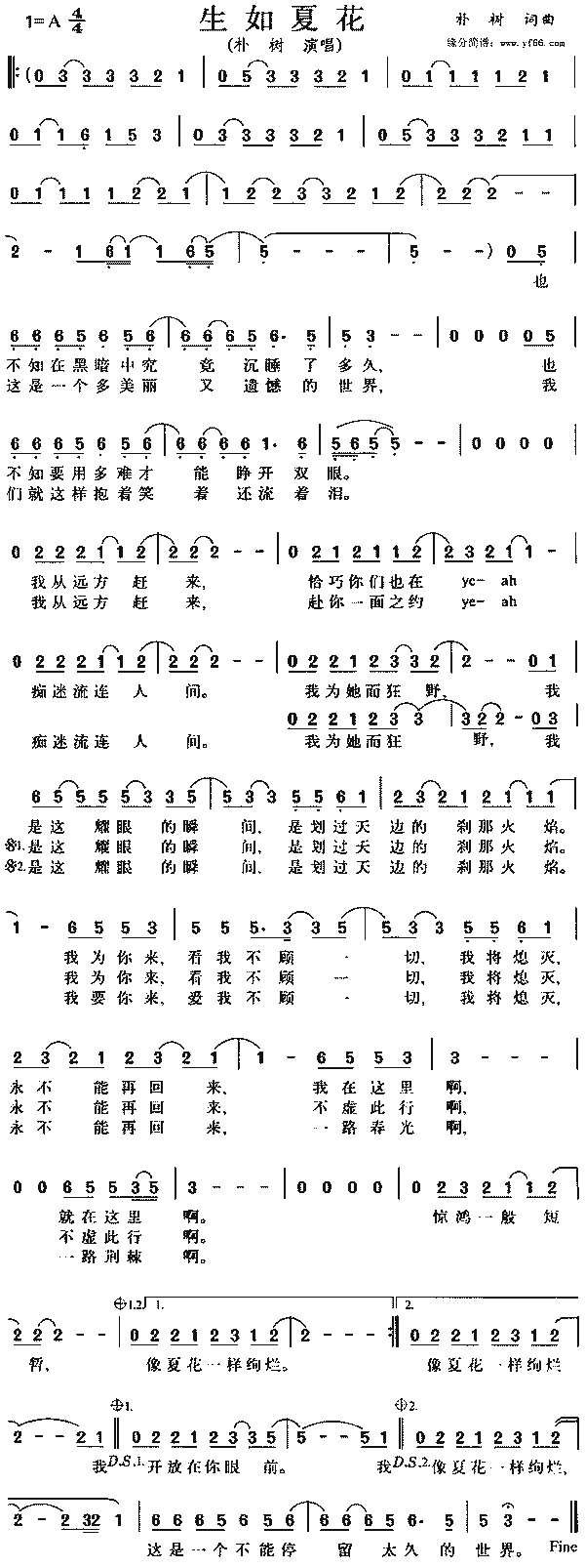 朴树,生如夏花——生如夏花 词曲:朴树编曲:朴树张亚东 也不知在黑暗中究竟沉睡了多久 也不知要有多难才能睁开双眼 我从远方赶来恰巧你们也在 痴迷流连人间我为她而狂野 我是这耀眼的瞬间 是划过天边的刹那火焰 我为你来看我不顾一切 我将熄灭永不能再回来 我在这里啊 就在这里啊 惊鸿一般短暂 象夏花一样绚烂 这是一个多美丽又遗憾的世界 我们就这样抱着笑着还流着泪 我从远方赶来赴你一面之约 痴迷流连人间我为她而狂野 我是这耀眼的瞬间 是划过天边的刹那火焰 我为你来看我不顾一切 我将熄灭永不能再回来 我在这里啊 就在这里啊 惊鸿一般短暂 象夏花一样绚烂 我是这耀眼的瞬间 是划过天边的刹那火焰 我为你来看我不顾一切 我将熄灭永不能再回来 不虚此行啊 不虚此行啊 惊鸿一般短暂 开放在你眼前 我是这耀眼的瞬间 是划过天边的刹那火焰 我为你来看我不顾一切 我将熄灭永不能再回来 一路春光啊 一路荆棘啊 惊鸿一般短暂 象夏花一样绚烂 这是一个不能停留太久的世界 |