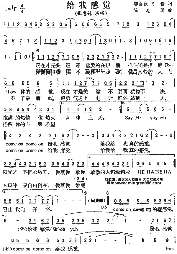 现在才是关键最重要的在眼前抓住还是拒绝 follow 你的感觉现在才是关键不要再犹豫不决 爆满的热情像烟火直冲上天 爱要爱的热切不要就干干脆脆 作白日梦的人上不了最前线 跟勇气通上电让脆弱站到一边 摇醒你的心跟希望 say hi say hi come on come on 给我感觉给我给我真的感觉(oh yeh) 阳光之下把心敞开爱就爱敢爱敢做的人超级精彩 he ya he ya come on come on 给我感觉 给我给我真的感觉(oh yeh) 大口呼吸自由自在爱就爱谁能阻止我们开怀 |