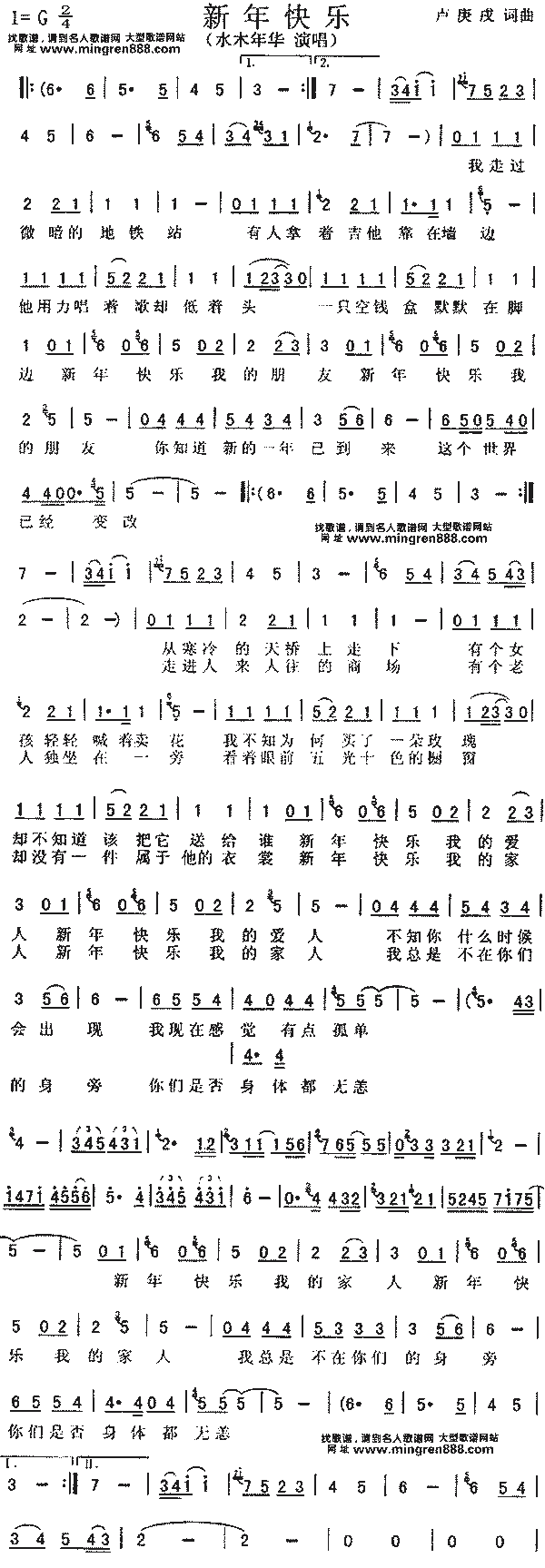 我走过为安的地铁站 有人拿着给他靠在墙边 他用力唱着歌却低着头 一直空前和默默在脚边 新年快乐我的朋友 新年快乐我的朋友 你知道新的一年已到来 这个世界已经变改 从寒冷的天桥上走下 有个女孩轻轻喊着买花 我不知道为何买了一朵玫瑰 却不知道该把它送给谁 新年快乐我的爱人 新年快乐我的爱人 不知你什么时候会出现 我现在感觉有点孤单 走进人来人往的商场 有个老人躲坐在一旁 看着眼前五光十色的橱窗 却没有一件属于他的衣裳 新年快乐我的家人 新年快乐我的家人 我总是不在你们的身旁 你们是否身体都无恙 新年快乐我的家人 新年快乐我的家人 我总是不在你们的身旁 你们是否身体都无恙 |