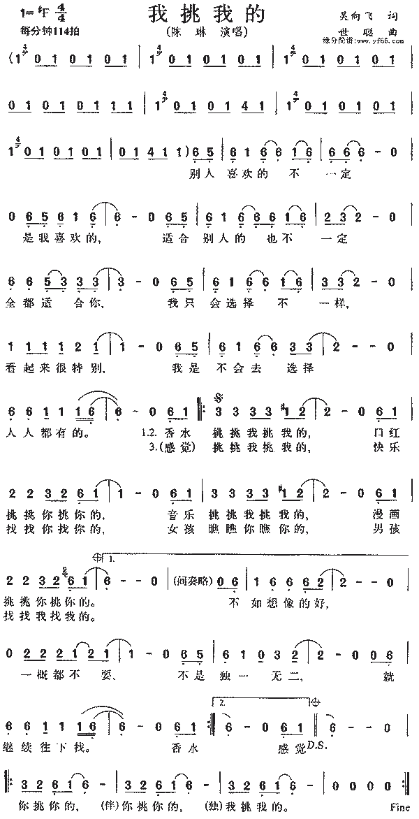 别人喜欢的不一定是我喜欢的 适合别人的也不一定全都适合你 我只会选择不一样看起来很特别 我是不会去选择人人都有的 香水挑挑我挑我的 口红挑挑你挑你的 音乐挑挑我挑我的 漫画挑挑你挑你的 不如想象的好一概都不要 不是独一无二就继续往下找 香水挑挑我挑我的 口红挑挑你挑你的 音乐挑挑我挑我的 漫画挑挑你挑你的 感觉挑挑我挑我的 快乐找找你找你的 女孩瞧瞧你瞧你的 男孩找找我找我的 香水挑挑我挑我的 口红挑挑你挑你的 音乐挑挑我挑我的 漫画挑挑你挑你的 感觉挑挑我挑我的 快乐找找你找你的 女孩瞧瞧你瞧你的 男孩找找我找我的 你挑你的 我挑我的...... |