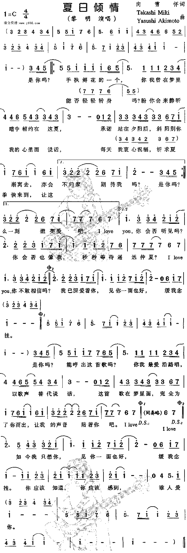 | 夏日倾情 是你吗手执鲜花的一个 你我曾在梦里暗中相约在这夏 承诺站在夕照后斜阳别你渐离去 亦会不归家期待我吗 是你吗能否轻轻转身吗 盼你会来静听我的心里面说话 每天我衷心祝祷祈求夏季快来到 让这么一刻燃亮爱吧 i love you 你会否听见吗 你会否也象我秒秒等待遥远仲夏 i love you 你不敢相信吗 我已深爱着你 如今我只想你 见你一面也好缓我念挂 是你吗能哼出这首歌吗 你我最爱沿路唱以歌声替代说话 这首歌在梦里面完全为了你而唱 让我的声音陪着你吧 你应该知道你应该感到谁人爱你 |