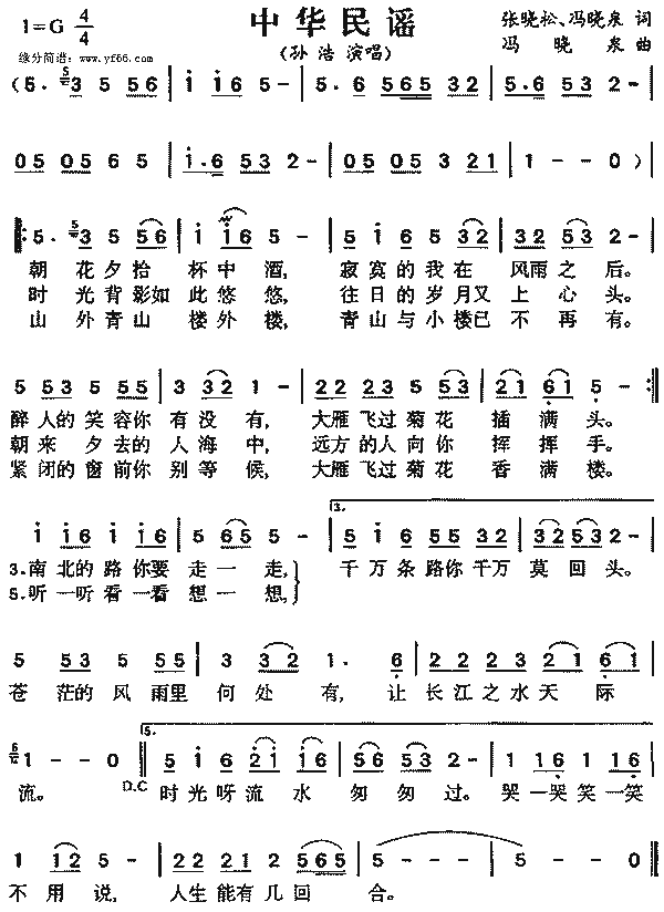 中华民谣 词:张晓松冯晓泉 曲:冯晓泉编曲:冯晓泉 童白:「朝花夕拾杯中酒 寂寞的人在风雨之后 醉人的笑容你有没有 大雁飞过菊花插满头 *朝花夕拾杯中酒 寂寞的我在风雨之后 时光的背影如此悠悠 往日的岁月又上心头 朝来夕去的人海中 远方的人向你挥挥手 南北的路你要走一走 千万条路你千万莫回头 苍茫的风雨何处游 让长江之水天际流 山外青山楼外楼 青山与小楼已不冉有 紧闭的窗前你别等候 大雁飞过菊花香满楼 听一听看一看想一想 时光呀流水匆匆过 哭一哭笑一笑不用说 人生能有几回合 童白:「风雪连天万户候 莲花宝座伸出兰花手 妙语解开心中事 几家拜我(欢乐)几家愁 |