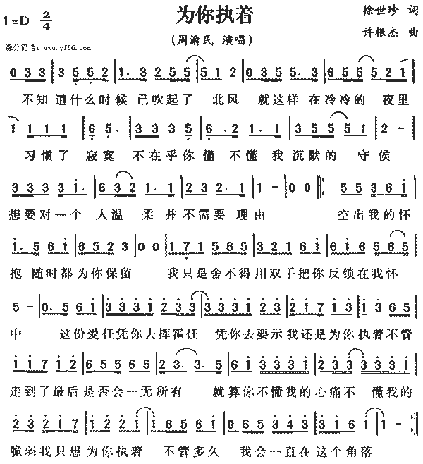 作曲:许根杰作词:徐世珍 不知道什么时候已吹起了北风 就这样在冷冷的夜里习惯了寂寞 不在乎你懂不懂我沉默的守候 想要对一个人温柔并不需要理由 空出我的怀抱随时都为你保留 我只是舍不得用双手把你反锁在我怀中 这份爱任凭你去挥霍任凭你去要求 我还是为你执着不管走到了最后是否会一无所有 就算你不懂我的心痛不懂我的脆弱 我只想为你执着不管多久我会一直在这个角落 空出我的怀抱随时都为你保留 我只是舍不得用双手把你反锁在我怀中 这份爱任凭你去挥霍任凭你去要求 我还是为你执着不管走到了最后是否会一无所有 就算你不懂我的心痛不懂我的脆弱 我只想为你执着不管多久我会一直在这个角落 任凭你去挥霍任凭你去要求我还是为你执着 不管走到了最后是否会一无所有 就算你不懂我的心痛不懂我的脆弱 我只想为你执着不管多久我会一直在这个角落 如果你有天回头什么都不必说 只要静静坐在身旁让风并肩吹过 |