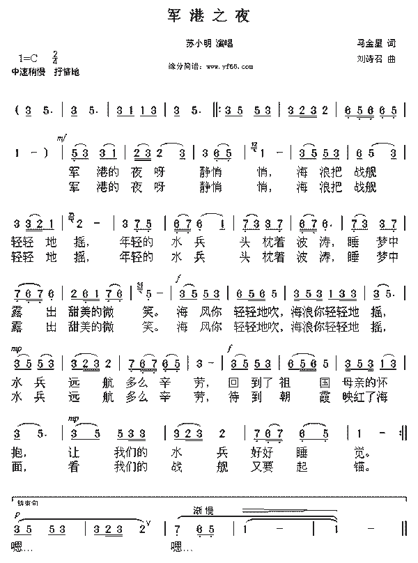 苏小明-军港之夜 军港的夜啊静悄悄, 海浪把战舰轻轻地摇, 年轻的水兵头枕着波涛, 睡梦中露出甜美的微笑 海风你轻轻地吹, 海浪你轻轻地摇, 年轻的水兵多么辛劳 回到了祖国母亲的怀抱, 让我们的水兵好好睡觉. music 军港的夜啊静悄悄, 海浪把战舰轻轻地摇, 年轻的水兵头枕着波涛, 睡梦中露出幸福的微笑 海风你轻轻地吹, 海浪你轻轻地摇, 年轻的水兵多么辛劳 回到了祖国母亲的怀抱, 让我们的水兵好好睡觉. music 军港的夜啊静悄悄, 海浪把战舰轻轻地摇, 年轻的水兵头枕着波涛, 睡梦中露出幸福的微笑 海风你轻轻地吹, 海浪你轻轻地摇, 年轻的水兵多么辛劳 待到朝霞映红了海面, 看我们的战舰又要起锚 |