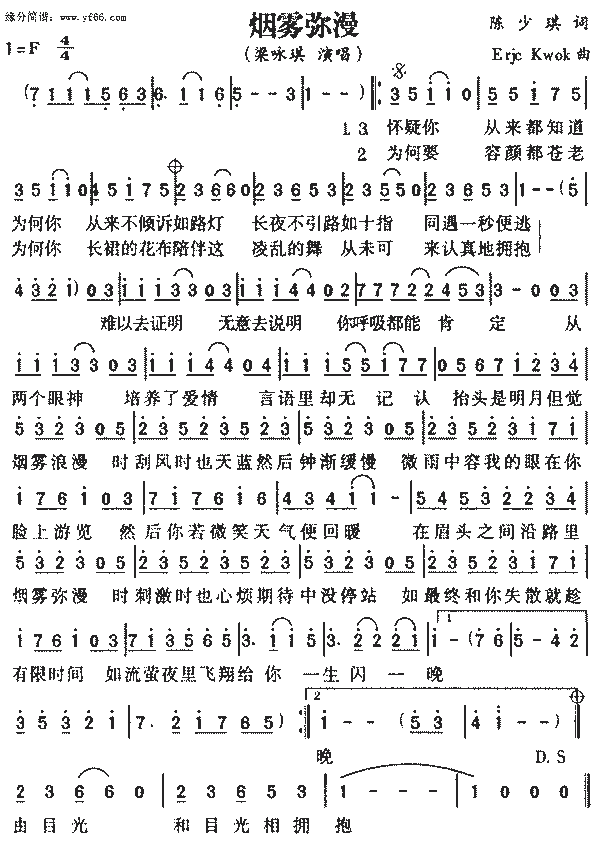 怀疑你 从来都知道 为何你 从来不倾诉 如路灯 长夜不引路 如十指 同遇一秒便逃 难以去证明 无意去说明 凭呼吸都能肯定 从两个眼神 培养了爱情 言语里却无记认 抬头是明月 但觉烟雾弥漫 时刮风时也天蓝 然后续渐缓慢 微雨中容我的眼 在你脸上游览 然后你若微笑 天气便回暖 在眉头之间沿路里 烟雾弥漫时刺激时 也心烦期待中没停站 如最终和你失散 就衬有限时间 如流莺夜里飞 想给你 一生小一晚 为何要 容颜都苍老 为何要 长裙的花布 陪伴这 零乱的舞步 从未可 来认真的拥抱 由目光 和目光相拥抱 |