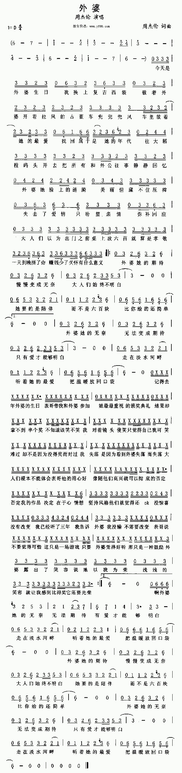 外婆 周杰伦 今天是外婆生日 我换上复古西装 载着外婆开着拉风的古董车兜兜兜风 车里放着她的最爱 找回属于是她的时年代 往大稻埋码头开去把所有和外公的往事静静回忆 外婆她脸上的涟漪 美丽但藏不住压抑 失去了爱情只盼望亲情 弥补回应 大人们以为出门之前桌上放六百就算是孝敬 一天到晚拼了命 赚钱少了关怀有什么意义 外婆她的期待 慢慢变成无奈 大人们始终不明白 她要的是陪伴 而不是六百块 比你给的还简单 外婆她的无奈 无法变成期待 只有爱才能够明白 走在淡水河衅 听着她的最爱 把温暖放回口袋 记得去年外婆的生日 表哥带我和外婆参加 她最最重视的颁奖典礼 结果却拿不到半个奖 不知该笑不笑 我对着镜头傻笑 只觉得自己可笑 我难过 却不是因为没有得奖而难过 我失落 是因为看到外婆失落而失落 大人们根本不能体会 表哥他的用心 好像随他们高兴就可以彻底的否定 否定我的作品 决定在于心情 想坚持风格他们他们就觉得很欢乐 没惊喜没有改变 我已经听了三年 我告诉外婆 我没输 不需要改变 表哥说不要觉得可惜 这只是一场游戏 只要外婆觉得好听 那才是一种鼓励 外婆露出了笑容说她以我为荣 浅浅的笑容 就让我感到比得奖它还要光荣 |
