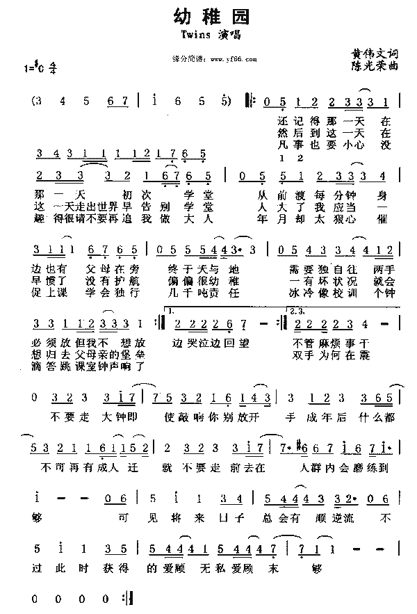 幼稚园 作曲:陈光荣 填词:黄伟文 编曲:陈光荣 监制:陈光荣 还记得那一天 在那一天 初次上学堂 从前渡每分钟 身边也有 父母在旁 终于天与地 需要独自往 两手必需放 但我不想放 边哭泣边回望 然后到这一天 在这一天 走出世界 早告别学堂 人大了我应当 一早惯了 没有护航 偏偏很幼稚 一有坏状况 就会想归去 父母亲的堡垒 不管麻烦事干 不要走 大钟即使敲响 你别放开手 成年后 什么都不可再 有成人迁就 不要走 前去在人群内 会磨炼到够 可见将来 日子总会有 顺逆流 不过此时 获得的爱护 无私爱护 未够 凡事也要小心 没趣得很 请不要再 迫我做大人 年月却太很狠心 催促上课 学会独行 几千吨责任 冰冷像校训 个钟啲塔跳 课室钟声响了 双手为何在震 |