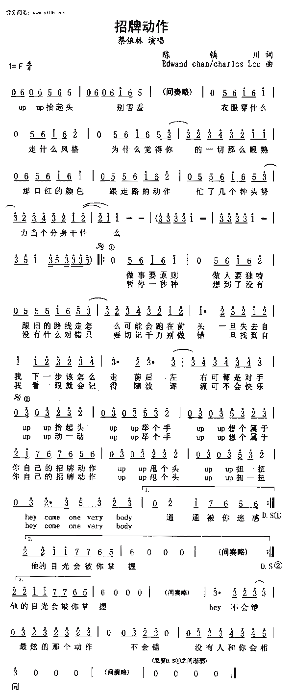 招牌动作 up up 抬起头 up up 别害羞 衣服穿什么 走什么风格 为什么觉得你的一切那么眼熟 那口红的颜色 跟走路的动作 喔牢记各种tone努力当个分身干什么 做事要原则 做人要独特 跟旧的路线走怎么可能会跑在前头 一旦失去自我 下一步该怎么走 前后左右可都是对手 up up 抬起头 up up 举个手 up up 想个属于你自己的招牌动作 up up 甩个头 up up 扭一扭 hey come on everybody 通通被你迷惑 up up 动一动 up up 举个手 up up 想个属于你自己的招牌动作 up up 甩个头 up up 扭一扭 hey come on everybody 他的目光会被你掌握 暂停一秒钟 想到了没有 没有什么对错只要切记千万别做错 一旦找到自我 看一眼就会记得 随波逐流可不会快乐 up up 抬起头 up up 举个手 up up 想个属于你自己的招牌动作 up up 甩个头 up up 扭一扭 hey come on everybody 他的目光会被你掌握 hey 不会错最炫的那个动作 不会错没有人和你会相同 up up 抬起头 up up 举个手 up up 想个属于你自己的招牌动作 up up 甩个头 up up 扭一扭 hey come on everybody 通通被你迷惑 up up 动一动 up up 举个手 up up 想个属于你自己的招牌动作 up up 甩个头 up up 扭一扭 hey come on everybody 他的目光会被你掌握 |