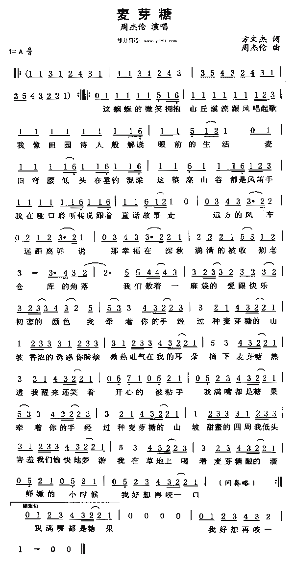 词:方文山曲:周杰伦 这蜿蜒的微笑拥抱山丘溪流跟风唱起歌 我像田园诗人般解读眼前的生活 麦田弯腰低头在垂钓温柔这整座山谷都是风笛手 我在哑口聆听传说跟着童话故事走 远方的风车远距离诉说 那幸福在深秋满满的被收割 老仓库的角落 我们数着一麻袋的爱跟快乐 初恋的颜色 我牵着你的手经过种麦芽糖的山坡 香浓的诱惑你脸颊微热 吐气在我的耳朵 摘下麦芽糖熟透我醒来还笑着 开心的被黏手 我满嘴都是糖果 牵着你的手经过种麦芽糖的山坡 甜蜜的四周我低头害羞 我们愉快的梦游 我在草地上喝着 麦芽糖酿的酒 鲜嫩的小时候 我好想再咬一口 |