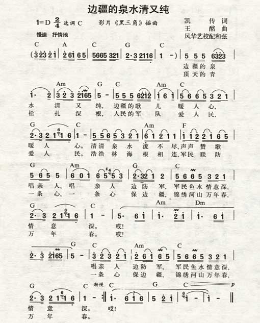 边疆的泉水清又纯 ---梦之旅合唱组合--- 边疆的泉水清又纯 清清泉水流不尽 声声赞歌唱亲人 唱亲人边防军 军民鱼水情意深情意深 哎...哎...哎....... 唱亲人边防军 军民鱼水情意深情意深 顶天的青松扎深根 人民的军队爱人民爱人民 浩浩林海根相连 军民联防一条心 一条心保边疆 锦绣河山万年春万年春 哎...哎...哎....... 一条心保边疆 锦绣河山万年春万年春 边疆的歌儿暖人心暖人心 清清泉水流不尽 声声赞歌唱亲人 唱亲人边防军 军民鱼水情意深情意深 哎...哎...哎....... 唱亲人边防军 哎...哎...哎....... 军民鱼水情意深情意深 一条心保边疆 锦绣河山万年春万年春 |
