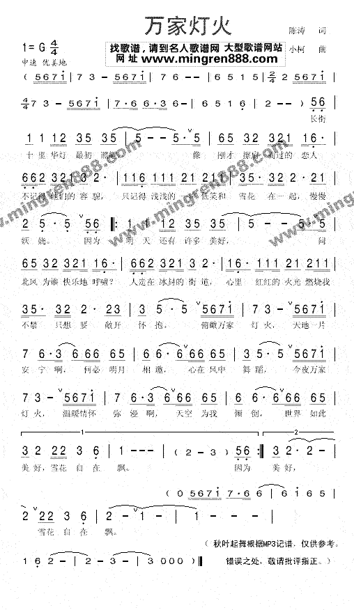 五彩缤纷的焰火星空灿烂的银河比不上你的壮丽磅礴 神州大地啊万家灯火你点燃不老的城镇 你照亮了丰收的村落你唤来了温馨的团聚 你带来了笑语欢歌大江南北城乡大漠 充满吉祥欢乐充满吉祥欢乐生我养我的这片土地啊永远唱着幸福的颂歌 五彩缤纷的焰火星空灿烂的银河比不上你的壮丽磅礴 神州大地啊万家灯火你指引着夜航的船舶你陪伴着不眠的哨所 你驱散着长夜的寂寞你象征着万民同乐长城内外江湖海河 跳动着时代的脉搏跳动着时代的脉搏生我养我的这片土地啊 永远唱着幸福的颂歌大江南北城乡大漠充满吉祥欢乐充满吉祥欢乐 大江南北城乡大漠充满吉祥欢乐充满吉祥欢乐 大江南北城乡大漠充满吉祥欢乐充满吉祥欢乐 |
