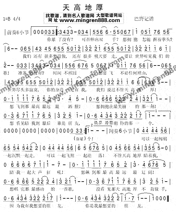 信乐团-天高地厚 作词:武雄 作曲:詹凌驾 keith stuart 你累了没有可否伸出双手 想拥抱怎能握着拳头 我们还有很多梦没做 还有很多明天要走 要让世界听见我们的歌 准备好没有时间不再回头 想要飞不必任何理由 不管世界尽头多寂寞 你的身边一定有我 我们说过不管天高地厚 想飞到那最高最远最洒脱 想拥抱在最美丽的那一刻 想看见陪我到最后谁是朋友 你是我最期待的那一个 可以一起闯祸一起沉默一起走 可以一起飞翔一起沦落 不管天高地厚陪着我 陪我一起大声狂吼 想飙到那最高最远最辽阔 想唱完那最感动的一首歌 没看见那天高地厚不肯放手 因为我有我想要的朋友 你是我最想要的朋友 |