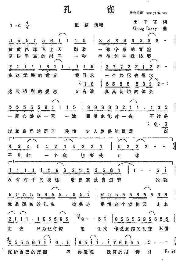 黄色气球飞上天, 绑着一张字条的冒险 在这无聊的世界, 我寻求一个共犯去想念 一颗心游荡一天, 一滴眼泪也能过一夜 不过是平凡的一个我, 想要爱上你 调快手表的时间, 一秒等待都叫我枯萎 这般强烈的爱恋, 又有谁真真切切的体会 说着奇怪的语言, 爱情让人发昏的撒野 而没有对手的我, 还是寂寞独自过节 我就像是孤独的孔雀, 被关进爱情这个动物园 走来走去只为让你惊艳 让我像是迷路的孔雀, 不懂保护自己的迂回 等你发现我真的很特别 (music) 调快手表的时间, 一秒等待都叫我枯萎 这般强烈的爱恋, 又有谁真真切切的体会 说着奇怪的语言, 爱情让人发昏的撒野 而没有对手的我, 还是寂寞独自过节 我就像是孤独的孔雀, 被关进爱情这个动物园 走来走去只为让你惊艳 让我像是迷路的孔雀, 不懂保护自己的迂回 等你发现我真的很特别 我心甘情愿走一个被忽略的孔雀, 我不能飞不能飞 我就像是孤独的孔雀, 被关进爱情这个动物园 走来走去只为让你惊艳 让我像是迷路的孔雀, 不懂保护自己的迂回 等你发现我真的很特别 |