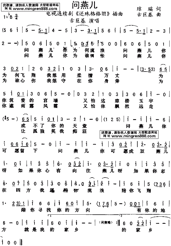 问燕儿你为谁心伤我想总在你身旁为你遮雨露风霜又怕你流浪远去让孤独叫我痴狂