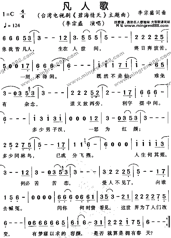 你我皆凡人生在人世间 终日奔波苦一刻不得闲 既然不是仙难免有杂念 道义放两旁利字摆中间 多少男子汉一怒为红颜 多少同林鸟已成分飞燕 人生何其短何必苦苦恋 爱人不见了向谁去和喊冤 问你何时曾看见这世界为了人们改变 有了梦寐以求的容颜是否就算是拥有春天 你我皆凡人生在人世间 终日奔波苦一刻不得闲 你既然不是仙难免有杂念 道义放两旁把利字摆中间 多少男子汉一怒为红颜 多少同林鸟已成了分飞燕 人生何其短何必苦苦恋 爱人不见了向谁去和喊冤 问你何时曾看见这世界为了人们改变 有了梦寐以求的容颜是否就算是拥有春天 |