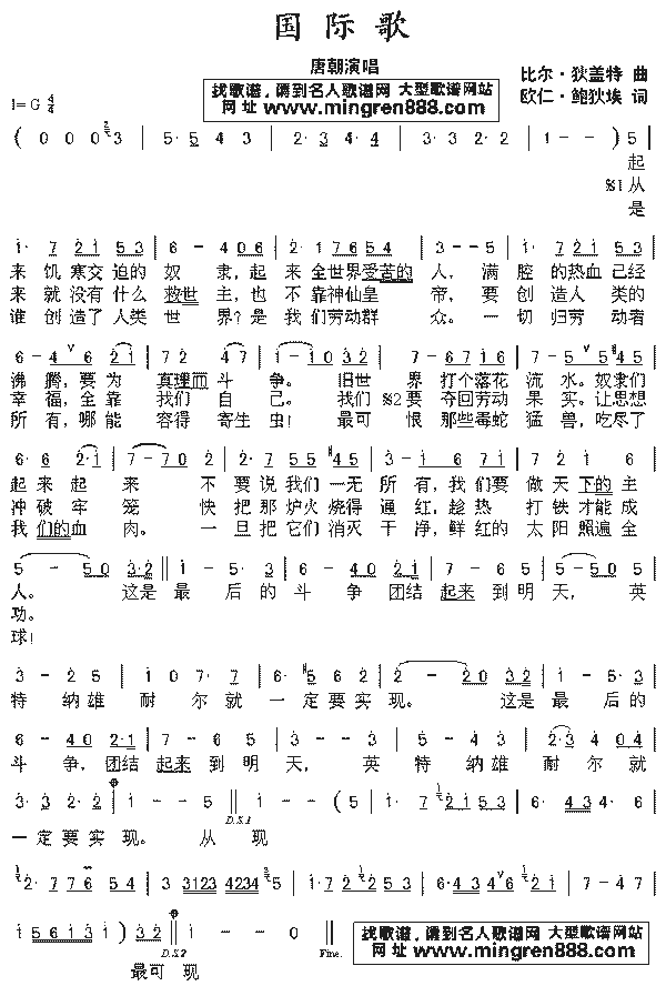 起来饥寒交迫的奴隶 起来全世界受苦的人 满腔的热血已经沸腾要为真理而斗争 旧世界打个落花流水奴隶们起来起来 不要说我们一无所有我们要做天下的主人 这是最後的斗争团结起来到明天 英特纳雄耐尔就一定要实现 这是最後的斗争团结起来到明天 英特纳雄耐尔就一定要实现 从来就没有什麽救世主也不靠神仙皇帝 要创造人类的幸福全靠我们自己 我们要夺回劳动果实让思想冲破牢笼 快把那炉火烧得通红趁热打铁才能成功 这是最後的斗争团结起来到明天 英特纳雄耐尔就一定要实现 这是最後的斗争团结起来到明天 英特纳雄耐尔就一定要实现 最可恨那些毒蛇猛兽吃尽了我们的血肉 一旦把他们消灭乾净鲜红的太阳照遍全球 这是最後的斗争团结起来到明天 英特纳雄耐尔就一定要实现 这是最後的斗争团结起来到明天 英特纳雄耐尔就一定要实现 英特纳雄耐尔就一定要实现 |