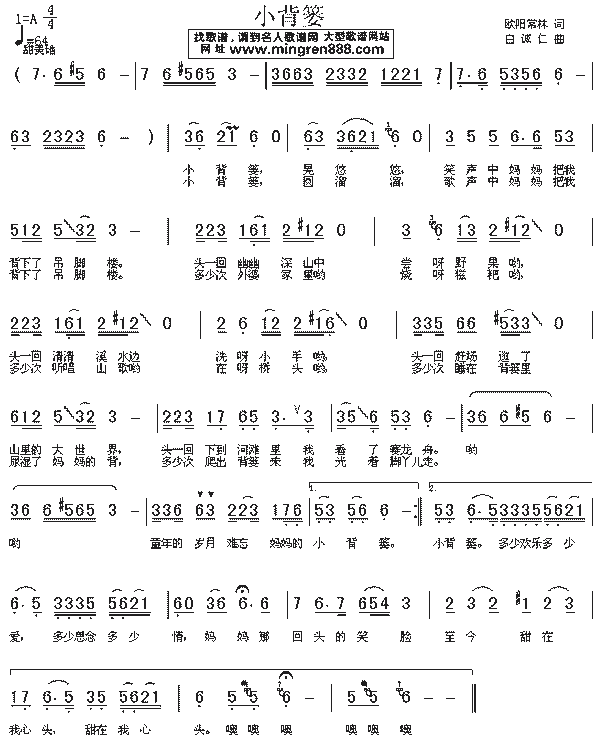 作词:欧阳常林作曲:白诚仁 小背篓晃悠悠 笑声中妈妈把我背下了吊脚楼 头一回幽幽深山中尝野果哟 头一回清清溪水边洗小手哟 头一回赶场逛了山里的大世界 头一回下到河滩里我看了赛龙舟 哟啊啊--哟啊啊 童年的岁月难忘妈妈的小背篓 小背篓圆溜溜 歌声中妈妈把我背下了吊脚楼 多少次外婆家里哟烧呀糍粑哟 多少次听唱山歌哟在呀桥头哟 多少次睡在背篓里尿湿了妈妈的背 多少次爬出背篓来我光着脚丫走 哟啊啊--哟啊啊 童年的岁月难忘妈妈的小背篓 多少欢乐多少爱 多少思念多少情 妈妈那回头的笑脸至今甜在我心头 甜在我心头 啊--啊--啊 |