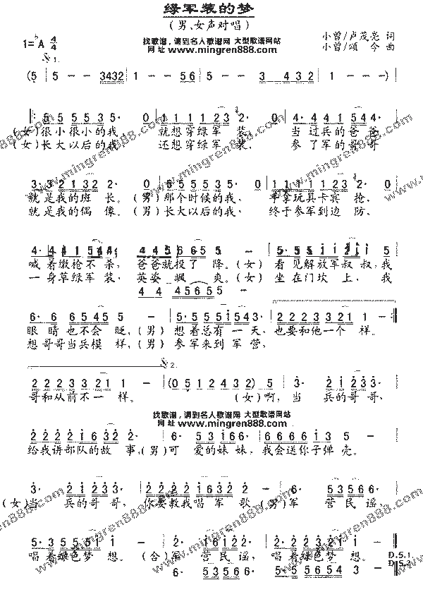 女)很小很小的我,就想穿绿军装,当过兵的爸爸就是我的班长. (男)那个时候的我,手拿玩具卡宾枪,喊着缴枪不杀爸爸就投了降. (女)看见解放军叔叔我眼睛也不会眨, (男)想着总有一天也要和他一个样. (女)长大以后的我,还想穿绿军装,参了军的哥哥就是我的偶像. (男)长大以后的我,终于参军到边防,一身草绿军装英姿飒爽. (女)坐在门坎上,我想哥哥当兵模样. (男)参军来到军营哥和从前不一样. (女)啊,当兵的哥哥,给我讲部队的故事. (男)可爱的妹妹,我会送你子弹壳. (女)当兵的哥哥,你要教我唱军歌. (男)军营民谣唱着绿色梦想. (合)军营民谣唱着绿色梦想 (女)长大以后的我,还想穿绿军装,参了军的哥哥就是我的偶像. (男)长大以后的我,终于参军到边防,一身草绿军装英姿飒爽. (女)坐在门坎上,我想哥哥当兵模样. (男)参军来到军营哥和从前不一样. (女)啊,当兵的哥哥,给我讲部队的故事. (男)可爱的妹妹,我会送你子弹壳. (女)当兵的哥哥,你要教我唱军歌. (男)军营民谣唱着绿色梦想. (合)军营民谣唱着绿色梦想 |