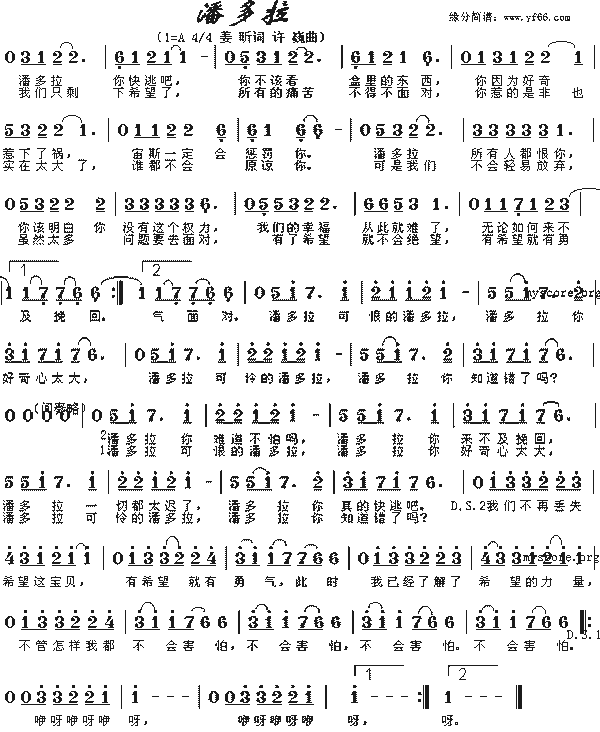 潘多拉,你快逃吧 你不该看盒里的东西 你因为好奇惹下了祸 宙斯一定会惩罚你 潘多拉,所有人都恨你 你该明白你没有这个权利 我们的幸福从此就难了 无论如何来不及挽回 我们只剩下希望了 所有的痛苦不得不面对 你惹的是非也实在太大了 谁都不会原谅你 可是我们不会轻易放弃 虽然太多问题要去面对 有了希望就不会绝望 有希望就有勇气面对 潘多拉,可恨的潘多拉 潘多拉,你好奇心太大 潘多拉,可怜的潘多拉 潘多拉,你知道错了吗 潘多拉,你难道不后悔 潘多拉,你来不及挽回 潘多拉,一切都太迟了 潘多拉,你真的快逃吧 我们不再丢失希望这宝贝 有希望就有勇气面对 我已经了解了希望的力量 不管怎样我都不会害怕 |