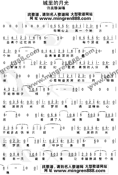 每颗心上某一个地方 总有个记忆挥不散 每个深夜某一个地方 总有着最深的思量 世间万千的变幻 爱把有情的人分两端 心若知道灵犀的方向 那怕不能够朝夕相伴 城里的月光把梦照亮 请温暖他心房 看透了人间聚散 能不能多点快乐片段 城里的月光把梦照亮 请守护它身旁 若有一天能重逢 让幸福撒满整个夜晚 每颗心上某一个地方 总有个记忆挥不散 每个深夜某一个地方 总有着最深的思量 世间万千的变幻 爱把有情的人分两端 心若知道灵犀的方向 那怕不能够朝夕相伴 城里的月光把梦照亮 请温暖他心房 看透了人间聚散 能不能多点快乐片段 城里的月光把梦照亮 请守护它身旁 若有一天能重逢 让幸福撒满整个夜晚 若有一天能重逢 让幸福撒满整个夜晚 |