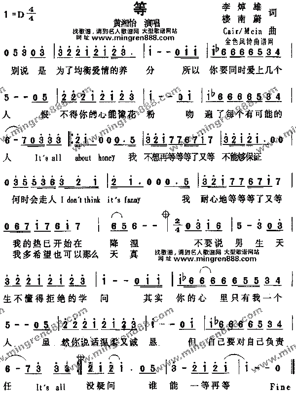 词:李焯雄 楼南蔚曲:d.carr meia 别说是为了均衡爱情的养分 所以你要同时爱上几个人 恨不得你的心能像花粉 吻遍了每个有可能的人 it's all about honey 我耐心的等等等了又等 但不能够保证何时会走人 i don't think it's funny 我不想再等等等了又等 我的热诚已开始在降温 不要说男生天生不懂拒绝的学问 其实你的心里只有我一人 虽然你说话温柔又诚恳 但自己要对自己负责任 it's all about honey 我耐心的等等等了又等 但不能够保证何时会走人 i don't think it's funny 我不想再等等等了又等 我多希望也可以那么天真 没疑问谁能一等再等 |