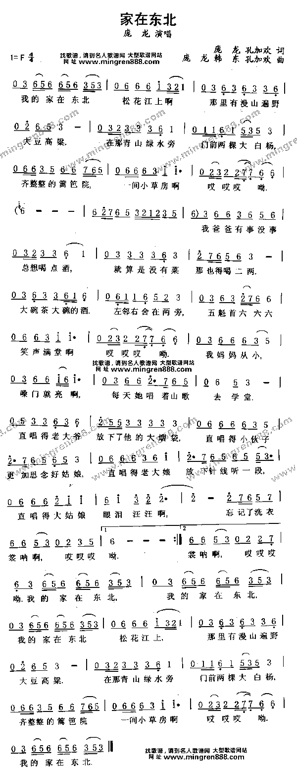 哎…哎… 嘿…嘿哟 我的家在东北 松花江上啊 那里有满山遍野大豆高粱 在那青山绿水旁 门前两棵大白杨 齐整整的篱笆院 一间小草房啊 哎… 我爸爸有事没事 总想喝点酒 就算是没有菜那也得喝二两 大碗茶大碗的酒 左邻右舍在两旁 五魁首六六六 笑声满堂啊 哎…哟 我妈妈从小嗓门就亮啊 每天她喝着山歌去学堂 直唱得老大爷 放下了他的大烟袋 直唱得小伙子 更加思念他姑娘 直唱得老大娘 放下针线听一段 直唱得大姑娘 眼泪汪汪啊 忘记了洗衣裳 哎…哟 music 哎… 我的家在东北 我的家在东北 我的家在东北 松花江上啊 那里有满山遍野大豆高粱 在那青山绿水旁 门前两棵大白杨 齐整整的篱笆院 一间小草房啊 哎…哟 我的家在东北 |
