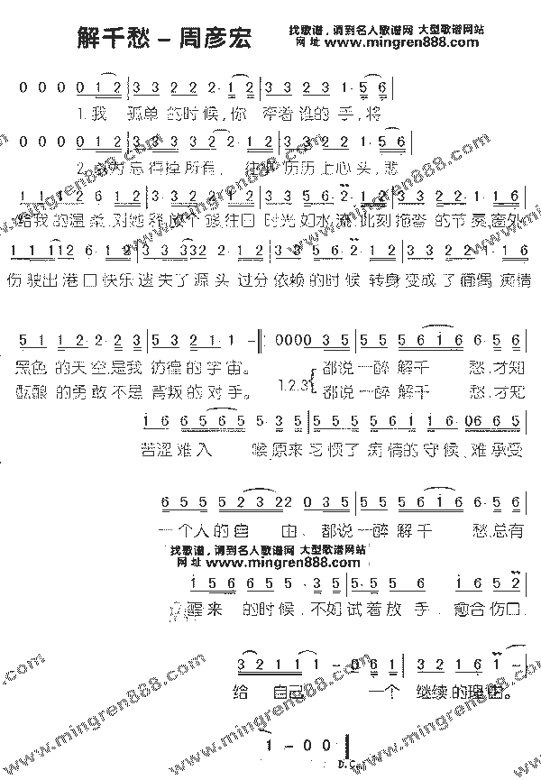 我孤单的时候 你牵着谁的手, 将给我的温柔, 对她释放个够. 往日时光如水流, 此刻拖它的节奏, 窗外黑色的天空, 是我彷徨的宇宙 都说一醉解千愁 才知苦涩难入吼 原来习惯了痴情的守侯 来遵守一个人的自由 都说一醉解千愁 总有醒来的时候 不如试着放手 愈合伤口 给自己一个继续的理由 以为忘得掉所有 往事历历上心头 悲伤是出港口 快乐遗失了源头 缘分以来的时候 钻石变成了面偶 事情一样的勇敢 不是背叛了对手 都说一醉解千愁 才知苦涩难入吼 原来习惯了痴情的守侯 来遵守一个人的自由 都说一醉解千愁 总有醒来的时候 不如试着放手 愈合伤口 给自己一个继续的理由 都说一醉解千愁 才知苦涩难入吼 原来习惯了痴情的守侯 来遵守一个人的自由 都说一醉解千愁 总有醒来的时候 不如试着放手 愈合伤口 给自己一个继续的理由 |