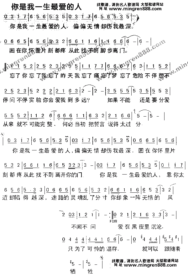 你是我一生最爱的人 你是我一生最爱的人 偏偏无情却伤我最深 困在你怀里片刻都疼 从此找不到离开你的门 忘了你忘了我忘了昨天 我忘了痛忘了梦忘了危险 不停想不停问不停实验 你会爱我到多远 如果不能还是要分 爱从来不可能完整 何必当初把誓言说得太过分 你是我一生最爱的人 偏偏无情却伤我最深 困在你怀里片刻都疼 从此找不到离开你的门 你是我一生最爱的人 靠你太近却陷得越深 迷路的灵魂乱了分寸 你却象一阵无情的风 不闻不问 music 爱在黑夜里沉沦 只为了可怜的温存 就可以跟随着起身 你是我一生最爱的人 偏偏无情却伤我最深 困在你怀里片刻都疼 从此找不到离开你的门 你是我一生最爱的人 靠你太近却陷得越深 迷路的灵魂乱了分寸 你却象一阵无情的风 不闻不问 |
