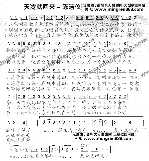 ~天冷就回来~ 陈洁仪 从前对着收音机 学唱旧的歌 我问妈妈为什么 伤心像快乐 妈妈笑着 说她也不懂得 我想出去走一走 妈妈点点头 天冷你就回来 别在风中徘徊 妈妈眼里有明白 还有一丝无奈 天冷我想回家 童年已经不再 昨天的雨点洒下来 那滋味叫做爱 wu... 别在风中徘徊 wu... 天冷就回来 渐渐对着收音机 学唱新的歌 我问朋友为什么 做梦也快乐 朋友笑说 他从不相信梦 我想出去走一走 朋友点点头 天冷你就回来 别在风中徘徊 朋友的眼里有明白 还有一份期待 天冷我想回家 年少已经不再 今天的雨点洒下来 那滋味就是爱 现在对着收音机 听自己唱的歌 我的他问为什么 幸福不快乐 我微笑着 说我也不懂得 他想出去走一走 我对他点点头 天冷你就回来 别在风中徘徊 我猜我眼里有明白 还有一丝无奈 天冷他没回家 我仍然在等待 明天的雨点洒下来 那滋味就是爱 wu... 别在风中徘徊 wu... 天冷就回来 |