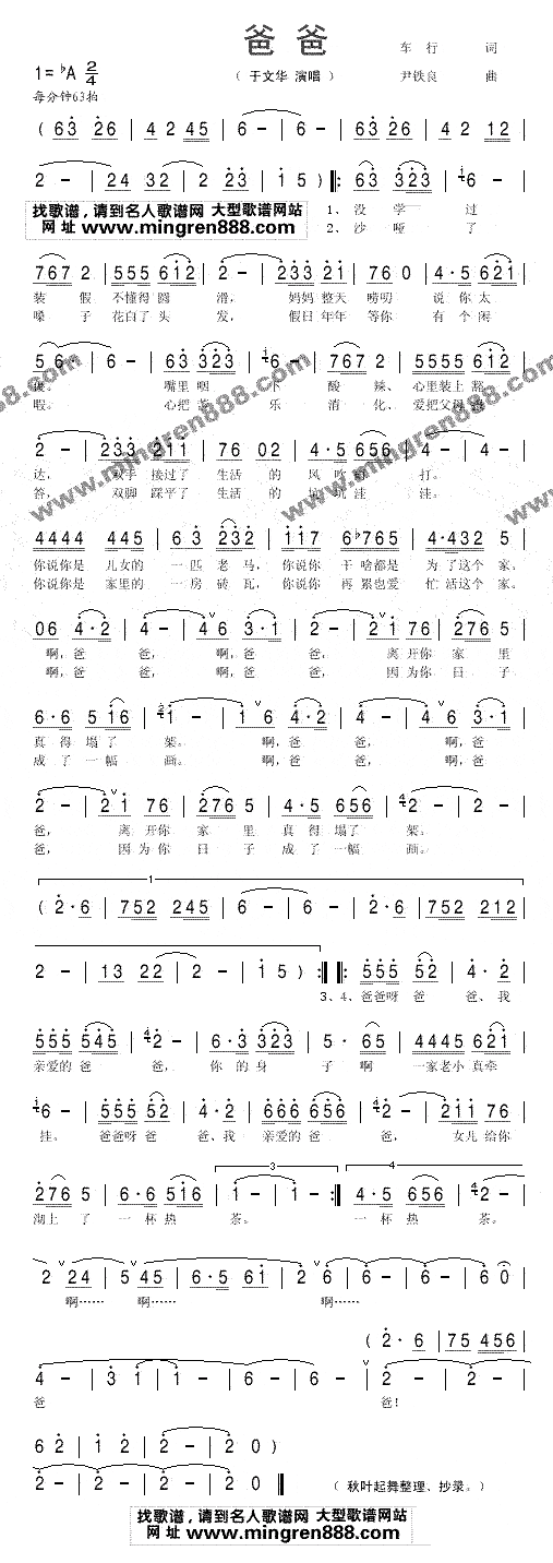 没学过装假、不懂得圆滑,妈妈整天唠叨说你太傻。嘴里咽下酸辣、心里装上豁达,双手接过了生活的风吹雨打。你说你是儿女的一匹老马,你说你干啥都是为了这个家。啊,爸爸,啊,爸爸,离开你家里真得塌了架。 沙哑了嗓子、花白了头发,假日年年等你有个闲暇。心把苦乐消化、爱把父母报答,双脚踩平了生活的坑坑洼洼。你说你是家里的一房砖瓦,你说再累也爱忙活这个家。啊,爸爸,啊,爸爸,因为你日子成了一幅画。 爸爸、爸爸、我亲爱的爸爸,你的身子一家老小都牵挂。爸爸、爸爸、我亲爱的爸爸,女儿给你沏上一杯热茶。 爸爸、爸爸、我亲爱的爸爸,你的身子一家老小都牵挂。爸爸、爸爸、我亲爱的爸爸,女儿给你沏上一杯热茶。啊……爸爸! |
