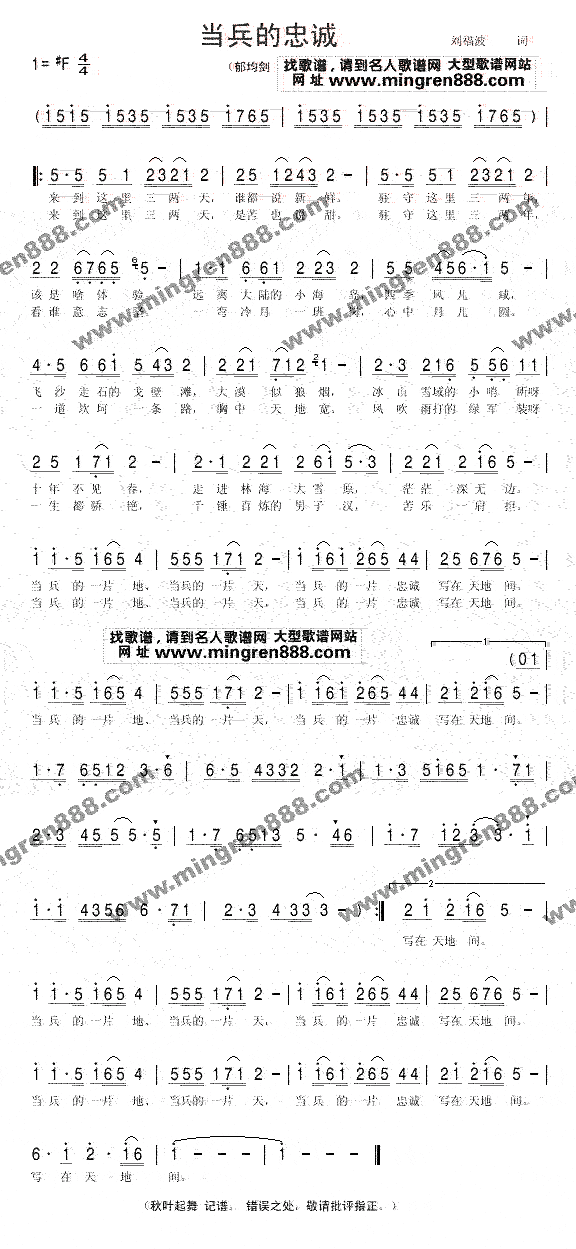 来到这里三两天,谁都说新鲜。驻守这里三两年,该是啥体验? 远离大陆的小海岛 四季风儿咸, 飞沙走石的戈壁滩 大漠似狼烟,冰山雪域的小哨所呀十年不见春, 走进林海大雪原 茫茫深无边。 当兵的一片地、当兵的一片天,当兵的一片忠诚写在天地间。 当兵的一片地、当兵的一片天, 当兵的一片忠诚写在天地间。 来到这里三两天,是苦也说甜。 驻守这里三两年,看谁意志坚!一弯冷月一班岗 心里月儿圆, 一道坎坷一条路 胸中天地宽,风吹雨打的绿军装呀一生都骄艳,千锤百炼的男子汉 苦乐一肩担。当兵的一片地、当兵的一片天, 当兵的一片忠诚写在天地间。 当兵的一片地、当兵的一片天, 当兵的一片忠诚写在天地间。 当兵的一片地、当兵的一片天, 当兵的一片忠诚写在天地间。 当兵的一片地、当兵的一片天, 当兵的一片忠诚写在天地间,写在天地间 |