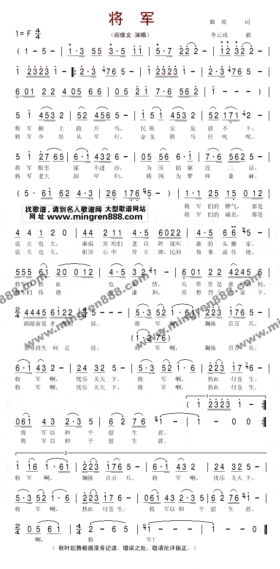 将军额上跑开马,民族安危放不下。将军眼里揉不进沙,卫国捐躯没二话。将军们的脾气,那是说大也大,谁祸害咱们老百姓,就叫谁的头搬家。将军们铁血也柔情,兵堆里慈祥的妈,娘跟前是孝顺的娃。将军啊,胸陈百万兵,将军啊,忧乐关天下,将军啊,热血付苍生,将军以和平慰生涯。 将军少壮从军行,金戈铁马任叱咤。将军老大卸甲归,铸剑为犁种桑麻。将军们的威名,那是说大也大,祖国心中耸丰碑,民间故事流传他。将军们伟德更谦和,常想先烈九泉下,荣辱得失何足挂。将军啊,胸陈百万兵,将军啊,忧乐关天下,将军啊,热血付苍生,将军以和平慰生涯。 将军啊,胸陈百万兵,将军啊,忧乐关天下,将军啊,热血付苍生,将军以和平慰生涯。啊……将军! |