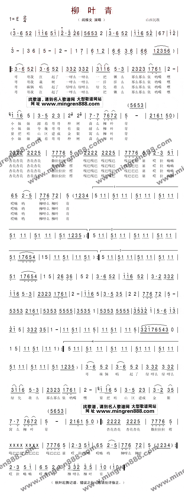 哥哥我扛起了(一呀么一呀么)一把锹 (么那乎那乎依哟嗬嘿) 小妹妹跟上哥哥种树苗(么柳叶青) (杏花杏花杏花杏花撒拉拉拉楞) (嘎巴嘎巴嘎巴嘎巴嘎巴巴巴崩) (哎拉嗨嗨哎嗨哟)柳呀么柳叶青 哥哥我栽树(一呀么一呀么)一排排 (么那乎那乎依哟嗬嘿) 小妹妹夸俺哥哥有能耐(么柳叶青) (杏花杏花杏花杏花撒拉拉拉楞) (嘎巴嘎巴嘎巴嘎巴嘎巴巴巴崩) (哎拉嗨嗨哎嗨哟)柳呀么柳叶青 哥妹俩唱起了(绿呀么绿呀么)绿化歌 (么那乎那乎依哟嗬嘿) 要把咱山区建成金银窝(么柳叶青) (杏花杏花杏花杏花撒拉拉拉楞) (嘎巴嘎巴嘎巴嘎巴嘎巴巴巴崩) (哎拉嗨嗨哎嗨哟)柳呀么柳叶青 哥哥我扛起了(一呀么一呀么)一把锹 (么那乎那乎依哟嗬嘿) 小妹妹跟上哥哥种树苗(么柳叶青) (杏花杏花杏花杏花撒拉拉拉楞) (嘎巴嘎巴嘎巴嘎巴嘎巴巴巴崩) (哎拉嗨嗨哎嗨哟)柳呀么柳叶青 哥妹俩唱起了(绿呀么绿呀么)绿化歌 (么那乎那乎依哟嗬嘿) 要把咱山区建成金银窝(么柳叶青) (杏花杏花杏花杏花撒拉拉拉楞) (嘎巴巴巴巴巴巴巴嘎巴巴巴崩) (哎拉嗨嗨哎嗨哟)柳呀么柳叶青 (杏花杏花杏花杏花撒拉拉拉楞) (嘎巴巴巴巴巴巴巴嘎巴巴巴崩) (哎拉嗨嗨哎嗨哟)柳呀么柳叶青 (哎拉嗨嗨哎嗨哟)柳呀么柳叶青 |