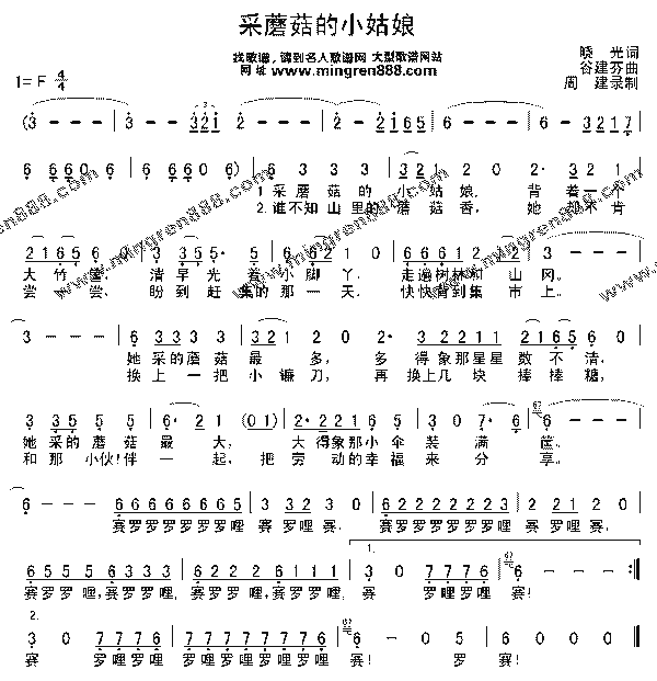 采蘑菇的小姑娘 采蘑菇的小姑娘背着一个大竹筐 清晨光着小脚丫走遍森林和山冈 她采的蘑菇最多 多得像那星星数不清 她采的蘑菇最大 大得像那小伞装满筐 噻箩箩哩噻箩箩哩噻 噻箩箩哩噻箩箩哩噻 噻箩箩箩噻箩箩箩噻箩箩箩噻箩箩箩哩噻 谁不知这山里的蘑菇香 她却不肯尝一尝 攒到赶集的那一天 赶快背到集市上 换上一把小镰刀 再加上几块棒棒糖 和那小伙伴一起 把劳动的幸福来分享 噻箩箩哩噻箩箩哩噻 噻箩箩哩噻箩箩哩噻 噻箩箩箩噻箩箩箩噻箩箩箩噻箩箩箩噻箩箩箩 music...... lrc:sunpzh 采蘑菇的小姑娘背着一个大竹筐 清晨光着小脚丫走遍森林和山冈 她采的蘑菇最多 多得像那星星数不清 她采的蘑菇最大 大得像那小伞装满筐 噻箩箩哩噻箩箩哩噻 噻箩箩哩噻箩箩哩噻 噻箩箩箩噻箩箩箩噻箩箩箩噻箩箩箩哩噻 谁不知这山里的蘑菇香 她却不肯尝一尝 攒到赶集的那一天 换上一把小镰刀 再加上几块棒棒糖 和那小伙伴一起 把劳动的幸福来分享 噻箩箩哩噻箩箩哩噻 噻箩箩哩噻箩箩哩噻 噻箩箩箩噻箩箩箩噻箩箩箩噻箩箩箩噻箩箩箩哩噻 music... 赶快背到集市上 换上一把小镰刀 再加上几块棒棒糖 和那小伙伴一起 把劳动的幸福来分享 噻箩箩哩噻箩箩哩噻 噻箩箩箩噻箩箩箩噻箩箩箩噻箩箩箩噻箩箩箩哩噻 噻箩箩哩噻箩箩哩噻 噻箩箩哩噻箩箩哩噻 噻箩箩哩噻箩箩哩噻 噻箩箩箩噻箩箩箩噻箩箩箩噻箩箩箩噻箩箩箩哩噻 |