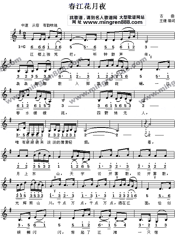 春江潮水连海平, 海上明月共潮生. 滟滟随波千万里, 何处春江无月明. 江流宛转绕芳甸, 月照花林皆似霰. 空里流霜不觉飞, 汀上白沙看不见. 江天一色无纤尘, 皎皎空中孤月轮. 江畔何人初见月, 江月何年初照人? 人生代代无穷已, 江月年年只相似. 不知江月待何人, 但见长江送流水. 白云一片去悠悠, 青枫浦上不胜愁. 谁家今夜扁舟子, 何处相思明月楼? 可怜楼上月徘徊, 应照离人妆镜台. 玉户帘中卷不去, 捣衣砧上复还来. 此时相望不相闻, 愿逐月华流照君. 鸿雁长飞光不渡, 鱼龙潜跃水成文. 昨夜闲潭梦落花, 可怜春半不还家. 江水流春去欲尽, 江潭落月复西斜. 斜月沉沉藏海雾, 碣石潇湘无限路. 不知乘月几人归, 落月摇情满江树. |