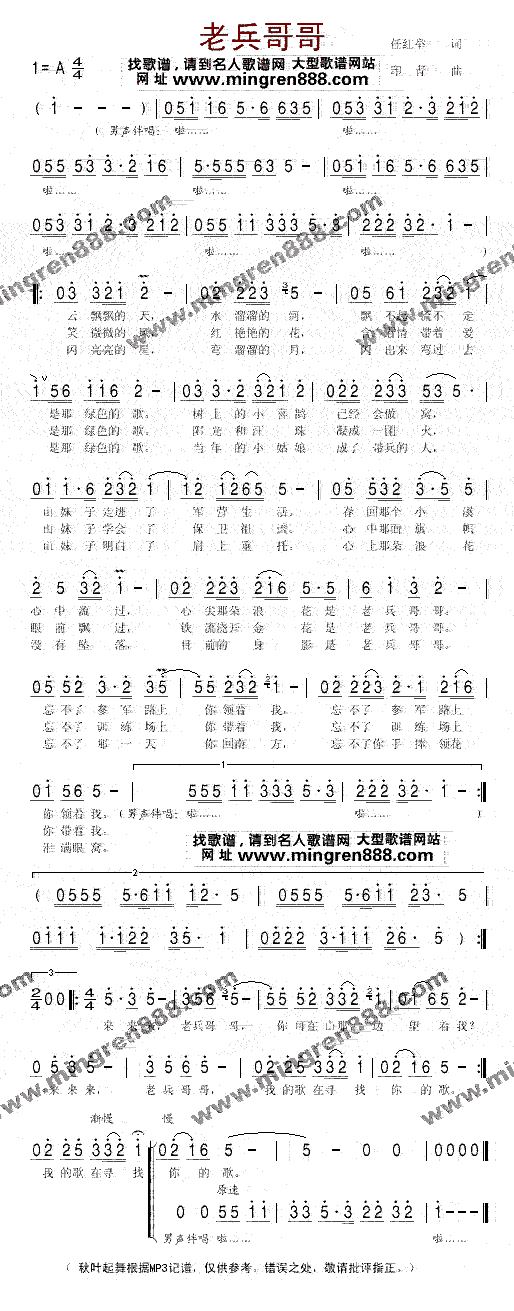 云飘飘的天 水溜溜的河飘不起流不走是那绿色的歌树上的小喜鹊已经会做窝山妹子走进了军营生活春回那个小溪心中流过心尖那朵浪花是老兵哥哥忘不了参军路上你领着我忘不了参军路上你领着我 笑微微的风 红艳艳的花含着情带着爱是那绿色的歌阳光和汗珠凝成一团火山妹子学会了保卫祖国心中那面旗帜眼前飘过铁流交开金花是老兵哥哥忘不了训练场上你带着我忘不了训练场上你带着我 闪亮亮的星 弯溜溜的月闪出来弯过去是那绿色的歌当年的小姑娘成了带兵的人山妹子明白了肩上重托心上那朵浪花没有堕落目前的身影是老兵哥哥忘不了那一天你回南方忘不了你手捧领花泪满眼窝 来……老兵哥哥你可在山那边望着我来……老兵哥哥我的歌在寻找你的歌来……老兵哥哥你可在山那边望着我来……老兵哥哥我的歌在寻找你的歌我的歌在寻找你的歌 |