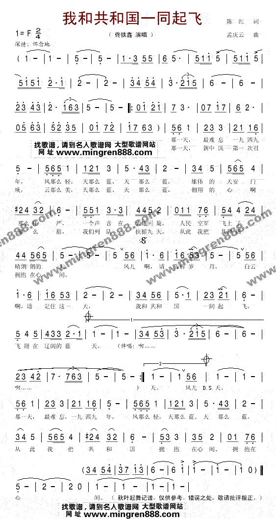 | 那一天,最难忘,1949年,风那么轻、天那么蓝,天那么蓝,雄伟的天安门那么庄严,一个声音在大地回旋,人民空军飞上了晴朗朗的天。风儿啊请告诉岁月,白云啊请记住这一天,我和共和国一同起飞,飞翔在辽阔的蓝天。 那一天,新中国,第一次召唤,云那么美、天那么蓝,天那么蓝,翱翔的心啊那么甜,我们列队、扶摇九天,从此我把共和国拥抱在心间。风儿啊请告诉岁月,白云啊请记住这一天,我和共和国一同起飞,飞向在辽阔的蓝天。 风儿啊请告诉岁月,白云啊请记住这一天,我和共和国一同起飞,飞翔在辽阔的蓝天。 那一天,最难忘,1949年,风那么轻、天那么蓝,天那么蓝,从此我把共和国拥抱在心间、拥抱在心间。 |