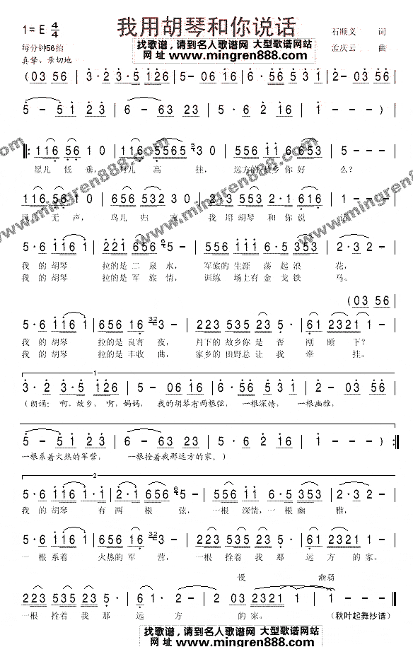 星儿低垂 月儿高挂 远方故乡的你好吗风儿无声 鸟儿归家 我用胡琴和你说话我的胡琴拉的是二泉水 军旅生涯荡起浪花我的胡琴拉的是良宵夜 月下的故乡是否刚睡下 (朗诵:啊,故乡 啊,妈妈我的胡琴有两根弦 一根深情 一根悠雅一根系着火热的军营 一根栓着我那远方的家……) 星儿低垂 月儿高挂 远方故乡的你好吗风儿无声 鸟儿归家 我用胡琴和你说话我的胡琴拉的是军旅情 训练声上有金戈铁马我的胡琴拉的丰收曲 家乡的田野总让我牵挂我的胡琴有两根弦 一根深情 一根悠雅一根系着火热的军营 一根栓着我那远方的家…… |