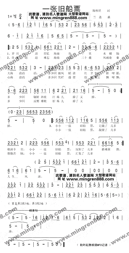 往事迢迢常忆海南岛, 千里水相隔大海浪滔滔, 多少回披风蹈浪啊红卫客轮摇啊摇, 多少回辗转奔波汗珠儿掉了又掉。 往事迢迢难忘海南岛, 三十载风雨沧桑心海浪滔滔, 多少回凭栏遥望啊胶雾椰云飘呀飘, 多少回反侧难眠泪珠儿掉了又掉。 小小一张旧船票记载了多少颠沛辛劳, 小小一张旧船票沉积了几多磨难煎熬。 小小一张旧船票凝聚了多少愁肠苦恼, 小小一张旧船票汇聚了几多人生风涛。