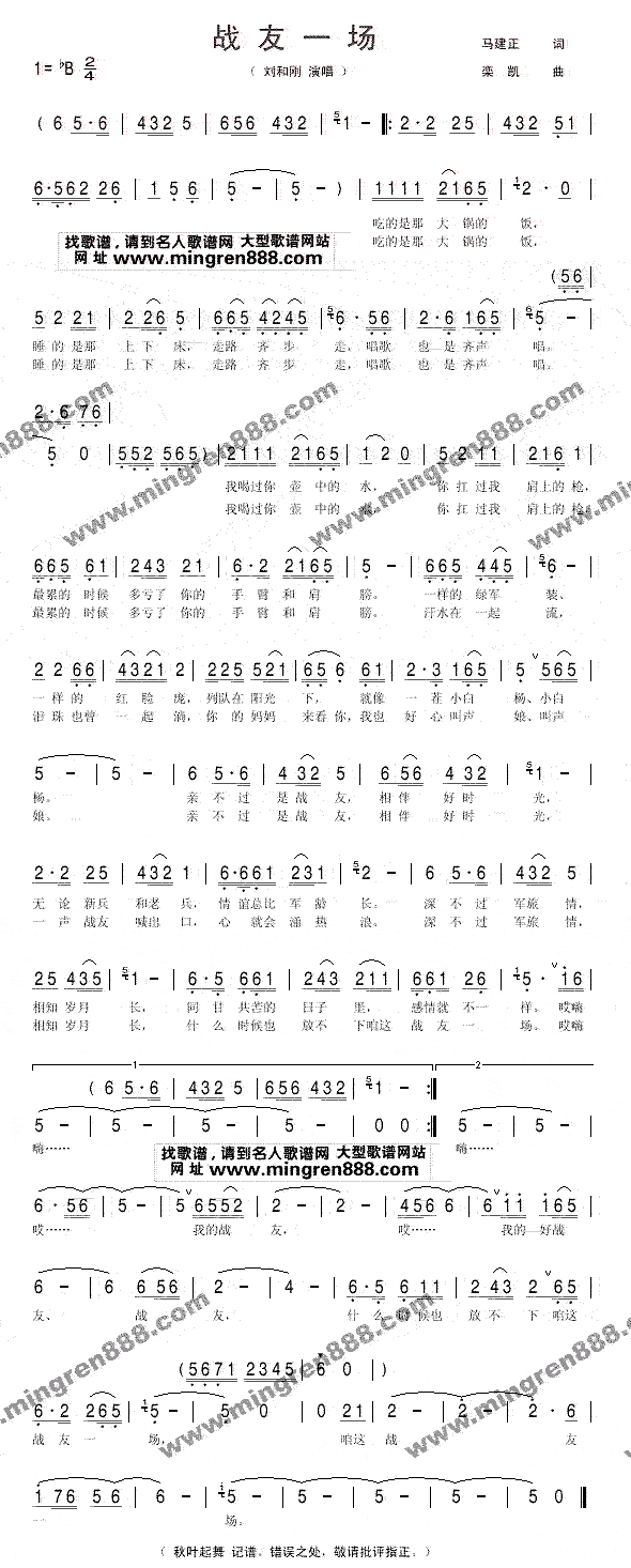 吃的是那大锅的饭,睡的是那上下床,走路齐步走,唱歌也是齐声唱。我喝过你壶中的水,你抗过我肩上的枪,最累的时候多亏了你的手臂和肩膀。一样绿军装,一样的红脸庞,列队在阳光下,就像一茬小白杨、小白杨。亲不过是战友,相伴好时光,无论新兵和老兵,情谊总比军龄长。深不过军旅情,相知岁月长,同甘共苦的日子里,感情就不一样。哎嘿嘿—— 吃的是那大锅的饭,睡的是那上下床,走路齐步走,唱歌也是齐声唱。我喝过你壶中的水,你抗过我肩上的枪,最累的时候多亏了你的手臂和肩膀。汗水在一起流啊,泪珠也曾一起淌,你的妈妈来看你,我也好心叫声娘、叫声娘。亲不过是战友,相伴好时光,一声战友喊出口,心里就会涌热浪。深不过军旅情,相知岁月长,什么时候也放不下,咱这战友一场。哎嘿嘿—— 哎,我的战友,哎,我的好战友、战友,什么时候也放不下,咱这战友一场,咱这战友一场。 |